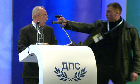 Tsvetan Tsvetanov, the interior minister, is reported to have said that the attacker tried to fire two shots but "most likely the gun misfired". However, other reports suggest that the weapon was a gas pistol, a non-lethal weapon used for self-defence, which can cause serious injuries when fired from close range.